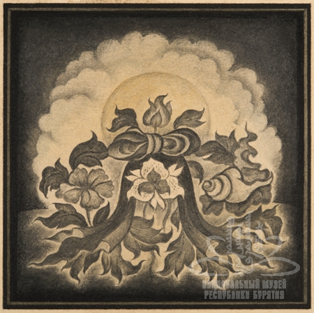 На листе квадратного формата в центре изображен цветок лотоса в окружении цветов, листьев и раковины на фоне
