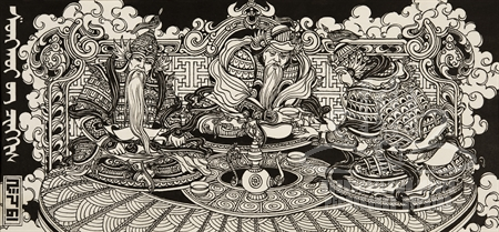 Подписи под изображением: «Шенхоров Ч.Б. Глава I. Встреча трех тэнгриев (Хан Хурмас, Сэгэн-Сэбдэг и Атай Улаан). 1993 г.»