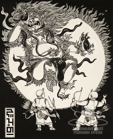 Подписи под изображением: «Шенхоров Ч.Б. Война Гэсэра с Абарга-Сэсэн Мангатхаем. 1993 г.»
