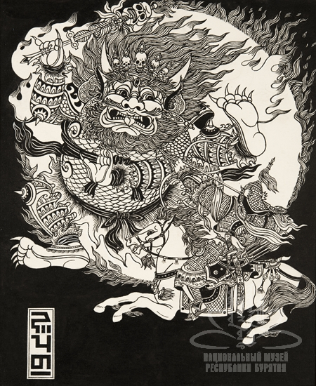 Подписи под изображением: «Шенхоров Ч.Б. Война Гэсэра с Архан Шудхэром. 1993 г.»