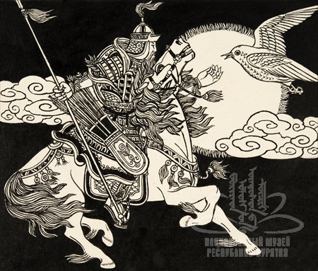 Подписи под изображением: «Абай Гэсэр Богдо Хаан. Глава VIII. Прощание Гэсэра с Алма-Мэргэн. 1993»