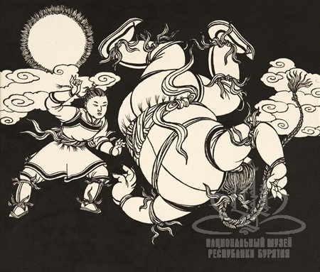 Подписи под изображением: «Абай Гэсэр Богдо Хаан. Глава IX. Борьба Гэсэра с Бухэ Сагаан. 1993»