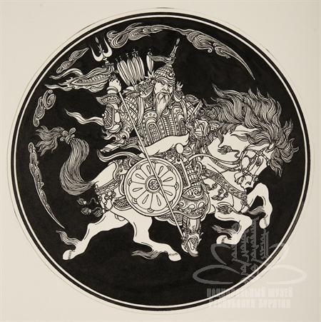 Подписи под изображением: «Абай Гэсэр Богдо Хаан. Предводитель 55-и тэнгэриев – Хаан Хурмас. 1993 Г.»