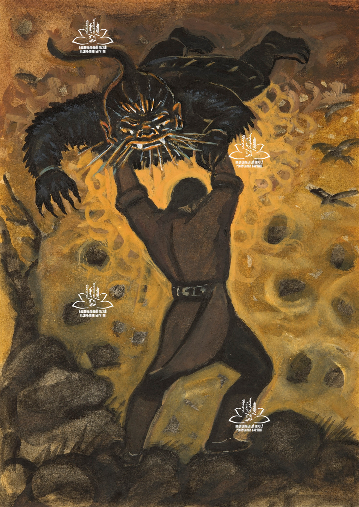 Подпись на паспарту: «Борьба Гэсэра с Архан-Хара Шудхэром. 1985 г. Сахаровская»