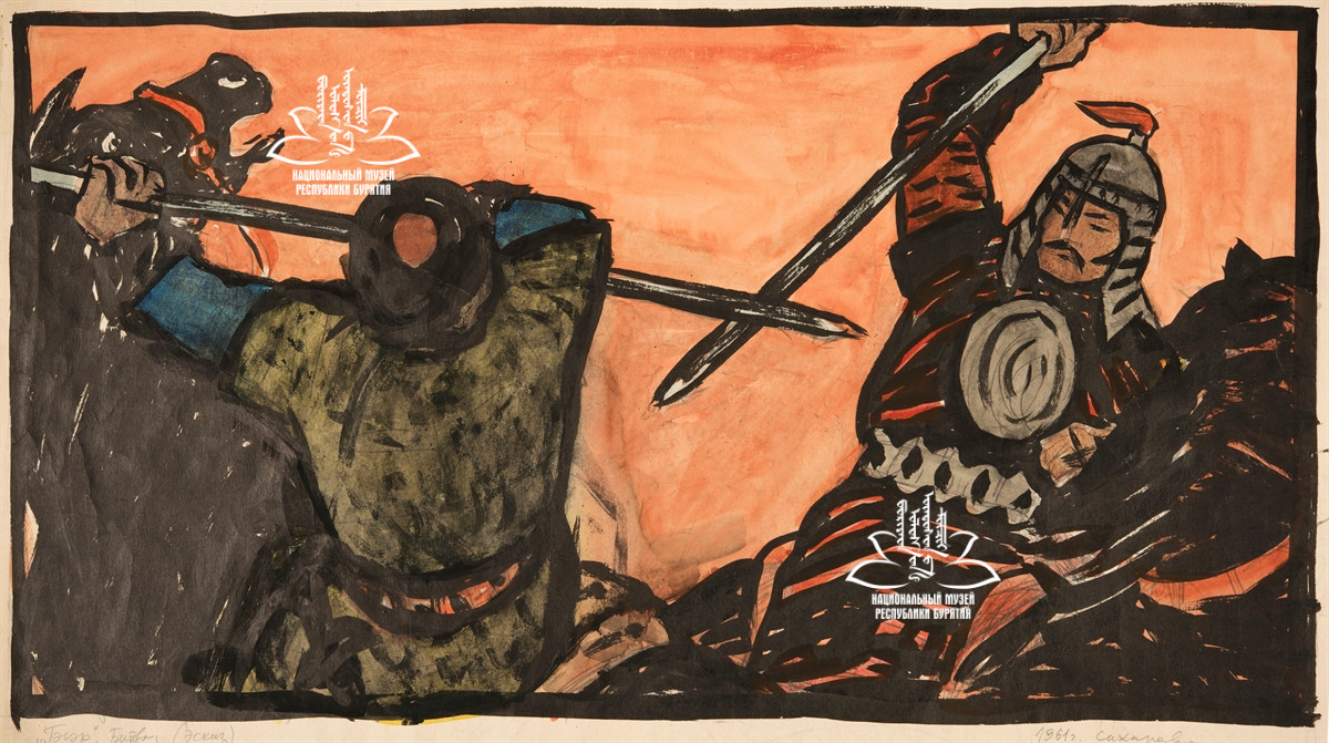 Подписи под изображением: «Гэсэр. Битва (Эскиз) 1961 г. Сахаровская. Б. акварель. 37х67»
