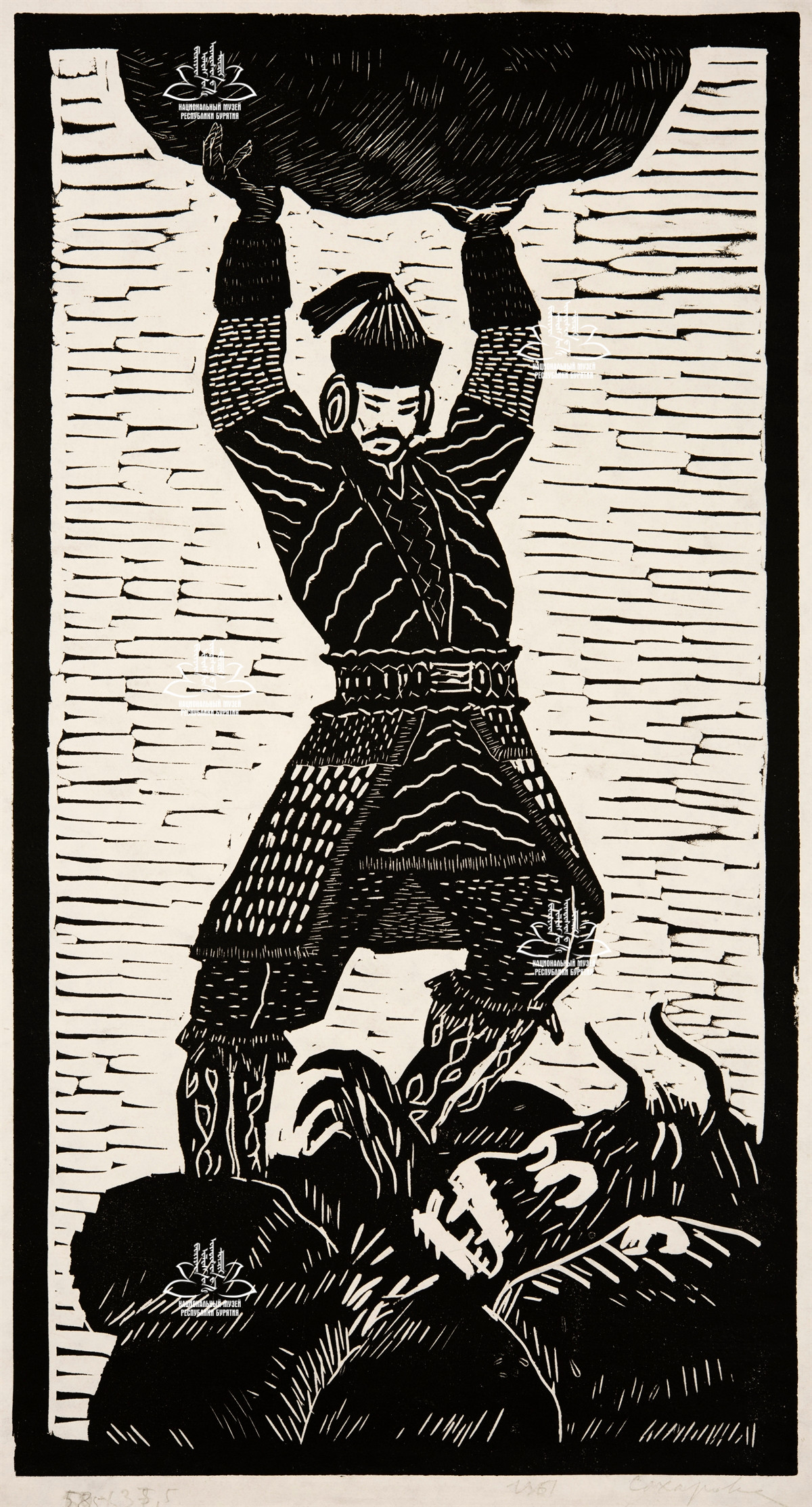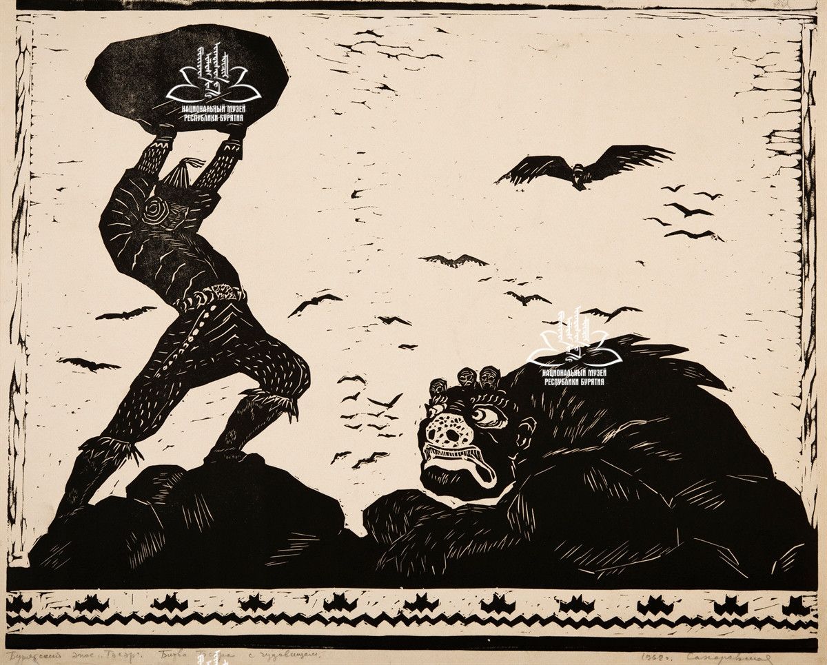 Подписи под изображением: «Бурятский эпос «Гэсэр»: Битва Гэсэра с чудовищем. 1962. Сахаровская»