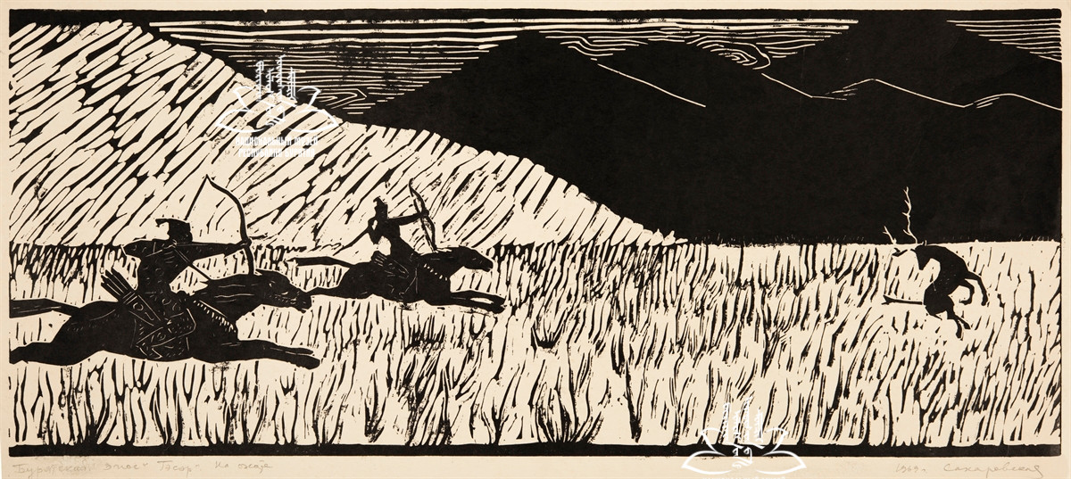 Подписи под изображением: «Бурятский эпос «Гэсэр». На охоте. 1969 г. Сахаровская»